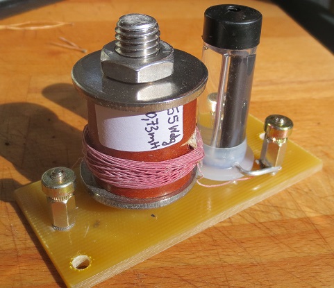 P.S. Hier zur Unterhaltung der noch nicht befüllte und verdrahtete Beschaltungsaufbau des pol Relais. Silicon muss noch trocknen und Alu- Elektrode ist zu kürzen. Die fette Schraube ist der Kern der Spule. 2mH...und recht breitbandig (Eigenresonanz) kommen zustande. Zwei diagonale Befestigungslöcher fürs Laborbrett fehlen noch. Morgen wird montiert, befüllt und probiert.