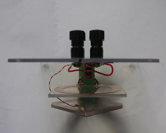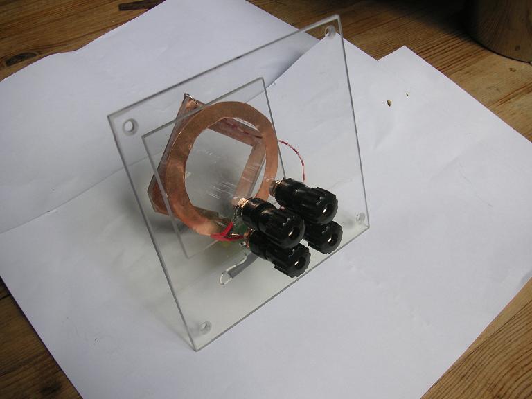 Mit den Koppelwindungen habe ich experimentiert und mich für einen Aufbau aus Kupferblech entschieden. Die ausgeschnittenen Teile (70mm / 60mm quadrat.) sind auf Macrolon aufgeklebt.