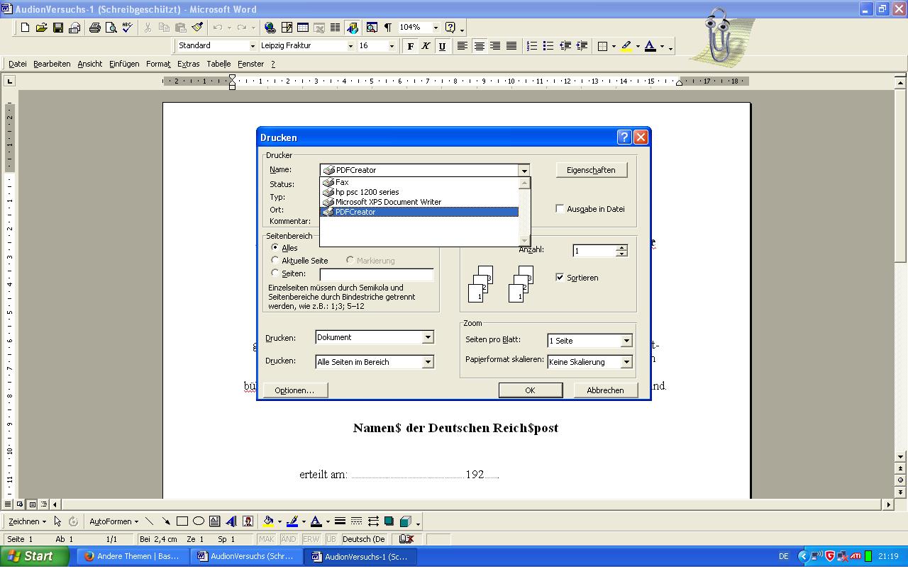 Die Audion-Versuchserlaubnis hat noch eine Rückseite und eine Anlage 2. Da sind noch einzelne Bestimmungen drin. Bitte beachten, es handelt sich um einen Gesetzestext. Wer es ganz genau wissen will siehe das Amtsblatt des Reichpostministerium Nr. 46/1924, S. 249 -279 Hab den Scan mit gscan2pdf und Linux BS mit einem Linux-Kompatiblen Scanner erstellt. Dann noch das Optimierungstool, das dauerte so 10 - 15 min.