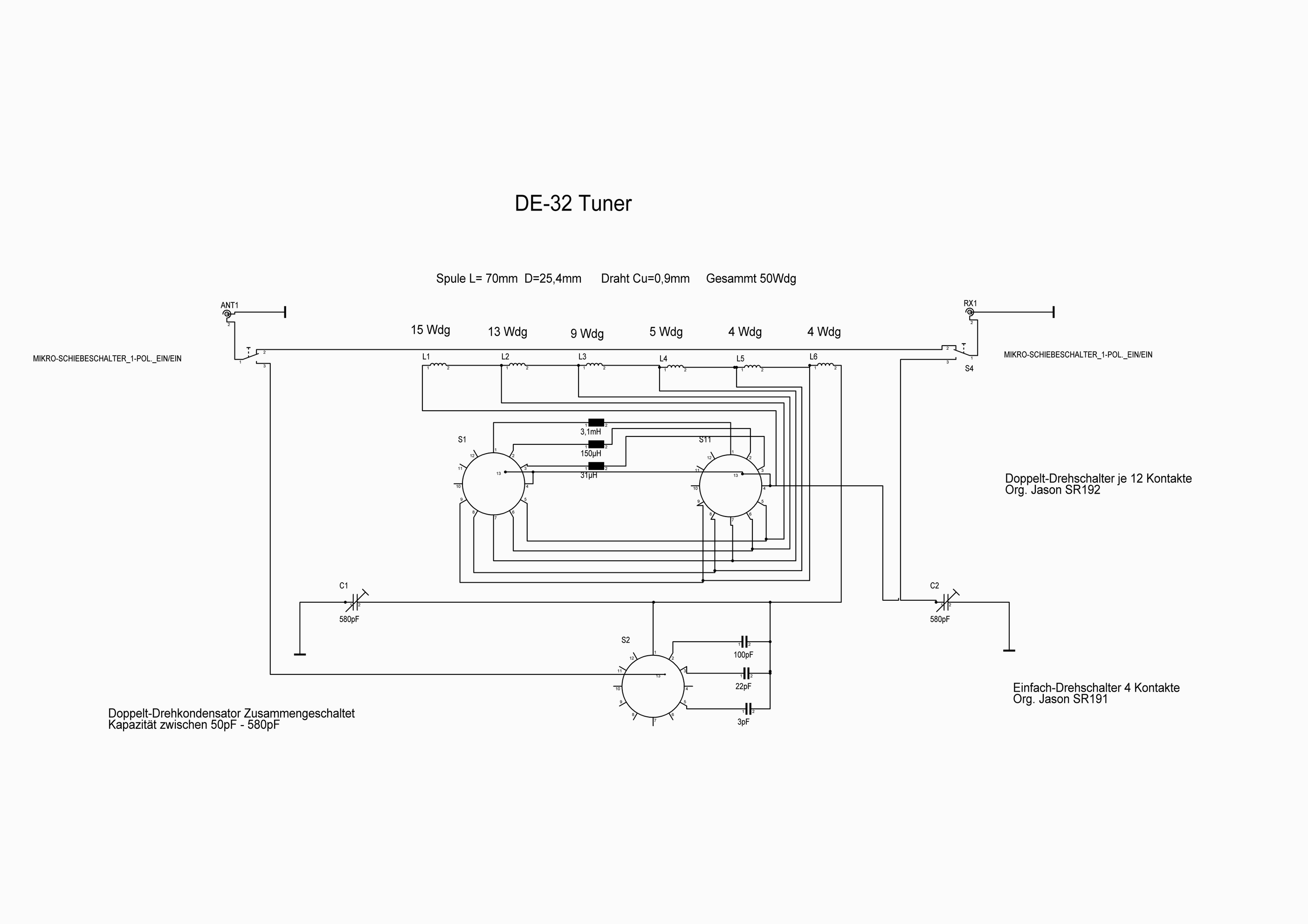 Nachtrag: Was ich am DE-32 sehr beeindruckend finde, ist das die angegebe Frequenzangabe auf dem Abgriffschalter der Filterspule, dein S1, sehr genau ist. Egal wie lang die Antenne ist...erstaunlich, oder? Warum passt die Eigeninduktivität der Antenne eigentlich fast immer in die Bereichswahl? 6m, 8m und 20m habe ich probiert. Also eine Beschriftung ist sehr ratsam, um schnell die passende Frequenz anzuwählen.