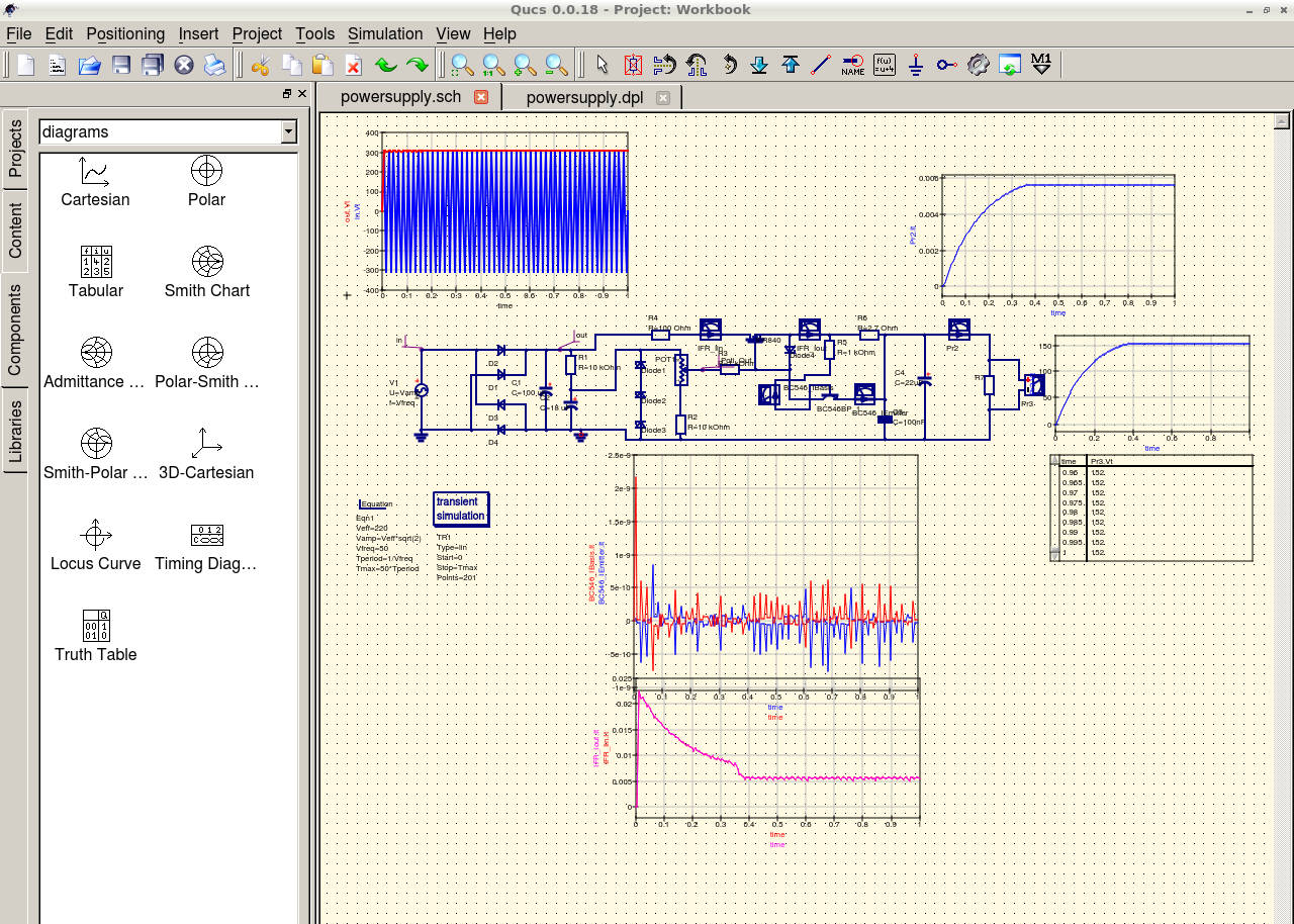 Ihre Netzteilaufbauten sehen sehr interessant aus. Ich habe leider nur einen Trennstelltrafo mit Gleichspannungsausgang und zwei Labornetzteile mit max. 60V/3A. Es besteht also noch Bedarf. Leider ist der IFR840 nicht zur Hand, somit bleibt zur Zeit nur der simulierte Aufbau in QUCS. Hier kann man auch das Regeln der Schaltung gut beobachten und noch optimieren.