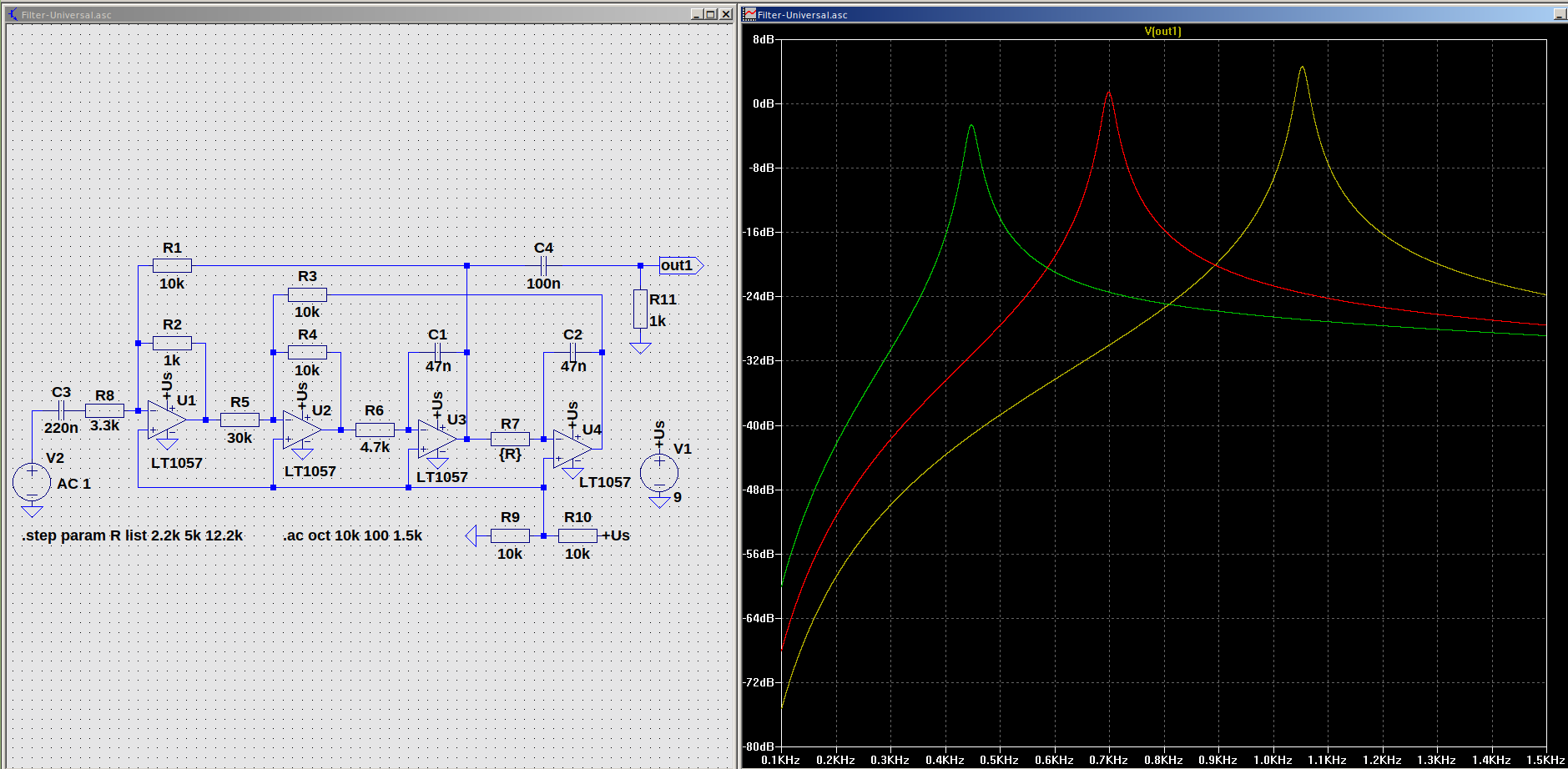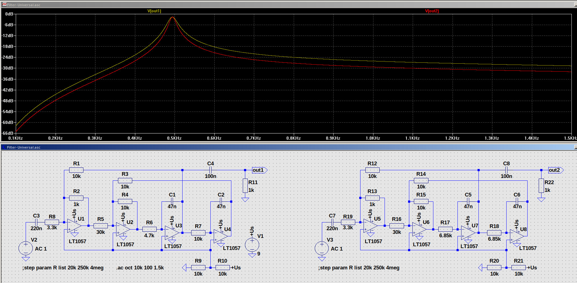 Ja, das Einfachpoti ist ein Kompromiß aber ein vertretbarer und falls Tandem, dann beide Potis mit Vorwiderstand. Der Wert ist nicht kritisch, das kann man sich anpassen, wie man es möchte. Es geht lediglich darum, den Verstellbereich nicht zu groß werden zu lassen. Mit der Frequenzverstellung ändern sich die Verstärkung und die Selektivität etwas. Die Originalschaltung ist hochohmiger ausgelegt, aber da gerade keine passenden Potis zur Hand waren... Habe mich mit der Schaltung zuletzt vor ein paar Jahren beschäftigt und darum zur Erinnerung heute mal die Sim. angeworfen. In dem Beispiel kann man die Unterschiede sehen, rechts mit Tandempoti (R17, R18), links mit einfachem (R7). Die Differenz ist nicht wirklich dramatisch. Es lohnt sich vielleicht im Voraus etwas zu experimentieren und sich die Schaltung nach den eigenen Bedürfnissen anzupassen.
