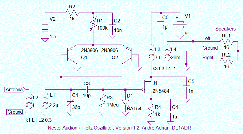 Die bisherigen FET Audion Schaltungen haben einen harten Schwingungseinsatz. Ein Differenzverstärker Oszillator (Peltz Oszillator, emitter coupled Oszillator) hat einen weichen Schwingungseinsatz. Die Version 1.2 des Empfänger besteht nun aus einem Nestel Audion ohne Rückkopplung und einem Peltz Oszillator als Exciter oder Q multiplier. Die beiden pnp Transistoren Q1 und Q2 realisieren einen negativen differentiellen Widerstand. Zusammen mit einem Schwingkreis ergibt sich ein Oszillator. Audion und Oszillator nutzen den gleichen Schwingkreis. Für mich gehört diese Schaltung zu den Autodyne Empfängern.