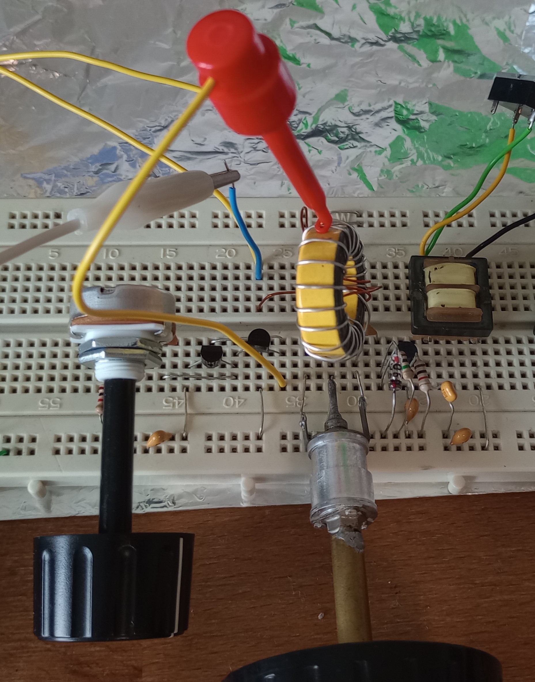 Ich teste gerade die Schaltung mit einem drei Transistor Verstärker anstelle dem Ausgangsübertrager. Für den HF-Teil kann ich schon sagen: mein Ziel, mit meinem Drehko von 7pF bie 36pF das 19m und 16m Band sowie mit anderem Ringkern das 49m und 41m Band abstimmen zu können wird mit Peltz Oszillator an Spulenanzapfung erreicht. Die Spulenanzapfung hat auch einen Nachteil: es kann parasitäre VHF Schwingungen geben. Deshalb ein 22 Ohm Widerstand als "Schwingbremse" zwischen Peltz Oszillator Ausgang und der Anzapfung des Schwingkreis.