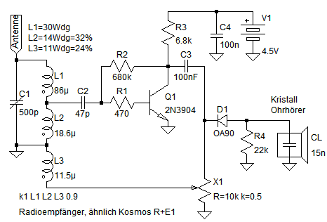 Ich habe den "Kosmos Radio+Elektronik 1" Transistorempfänger simuliert, geändert und aufgebaut. Die Schaltung ist weder ein RK-Audion noch ein Reflexempfänger. Ein Meissner-Oszillator in Leithäuser-Schaltung entdämpft den Schwingkreis, bzw. arbeitet als Autodyne. Eine Diode hinter dem Oszillator führt die Demodulation aus.