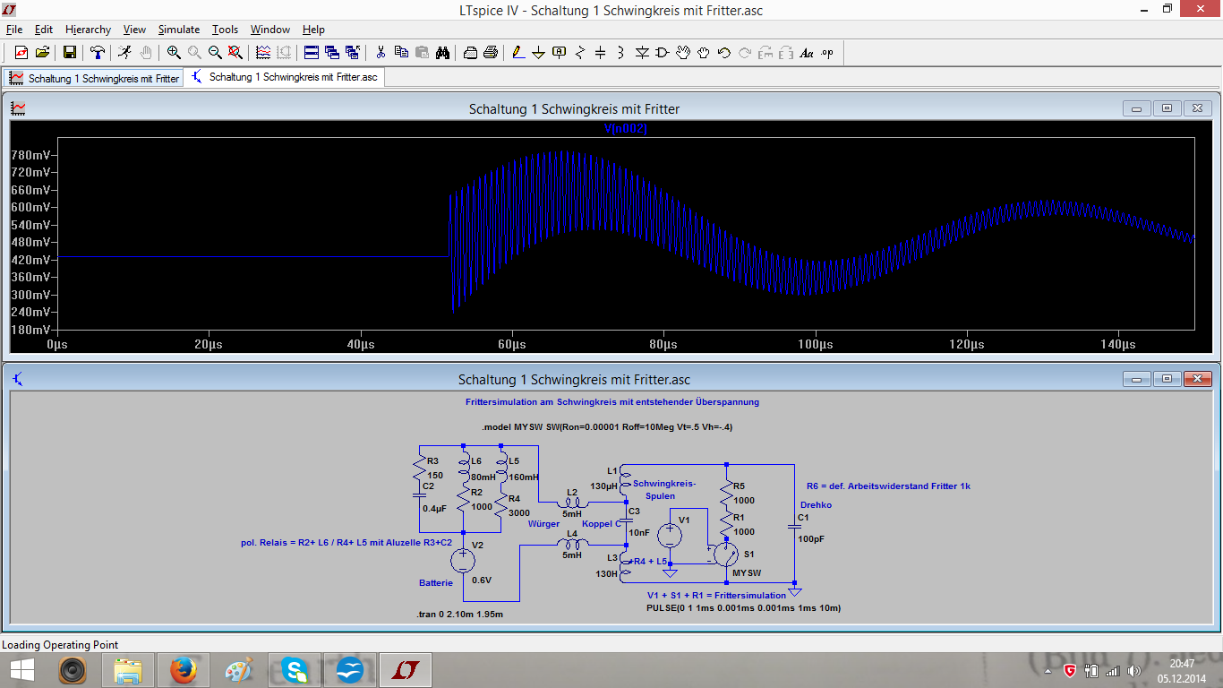 Hier eine Schaltungssimulation ohne Drosseln und Relaisinduktivitäten. Die Überspannung wird also wirklich, wie ich viel weiter oben schon berichtete, direkt im Schwingkreis generiert. Um das Beispiel gut zu simulieren... habe ich meine erste Schaltungsweise gewählt. Die entstehende Überspannung ist schon gewaltig im Bereich von nur 0.6V Fritterkreisspannung. Diesen Versuch habe ich auch am unangeschlossenen Rahmenschwingkreis praktisch nachvollzogen. Also nur Schwingkreis mit Vorwiderstand! Die Überspannung ist abhangig von der Höhe des möglichen Induktionsstromes bedingt durch Widerstand Fritter bei HF xx und Relaiswiderstand xx !!!