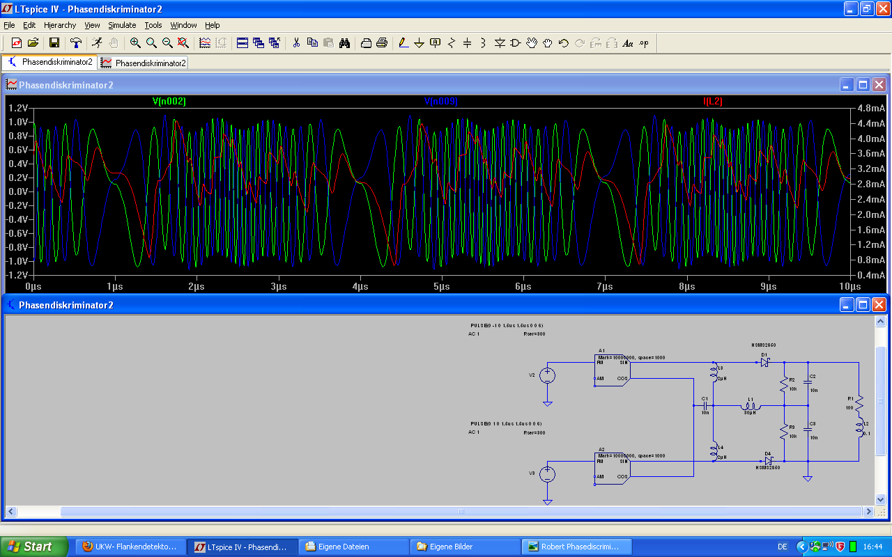 Ich habe mit Spice festgestellt, dass bei meinem ersten Model, sich alle Spannungen im Kreis synchronisieren sowie ein Kondensator eingesetzt wird. Die 180 Grad der entgegengesetzten Teilspannungen und auch der 90 Grad Phasenversatz waren dahin. Deswegen habe ich dann einen Trick angewendet und ein stabileres Model entwickelt, und einmal die R.W. Schaltung und einen Phasendiskriminator aufgebaut. Das Problem des Phasenversatzes konnte ich mit einem sin/cos- Generator umsetzen und konnte damit die Schaltung stabilisieren, da die Transformationen des Eingangsbaluns wegfallen. Die Ergebnisse zu interpretieren ist bei Spice nicht einfach,... ich meine die Frequenzdemodulation sichtbar zu machen. Die Ergebnisse der Messungen an den Teilinduktivitäten Drossel usw. fallen bei den Schaltungen ziemlich ähnlich aus....die Bewertung über den Winkel konnte ich noch nicht umsetzen, geschweige denn eine NF-Frequenz rauszaubern...