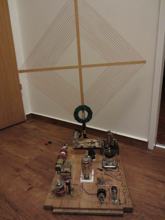 Wenn alles auf dem Tisch steht kann ich auch schon richtig Morsezeichen übertragen. Nun muß das ganze Induktorgeprassel erst mal auf ein Brett und ein Akku dran.