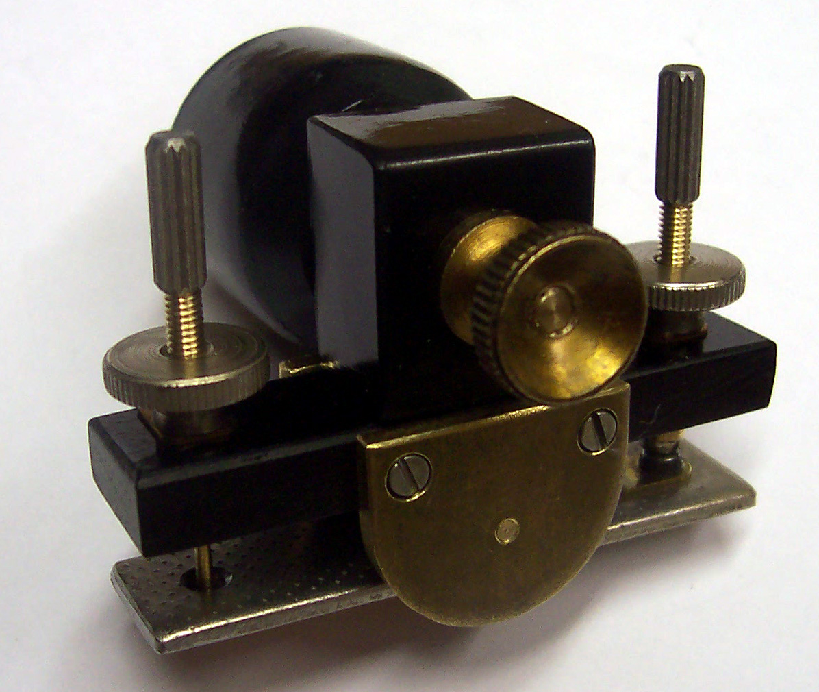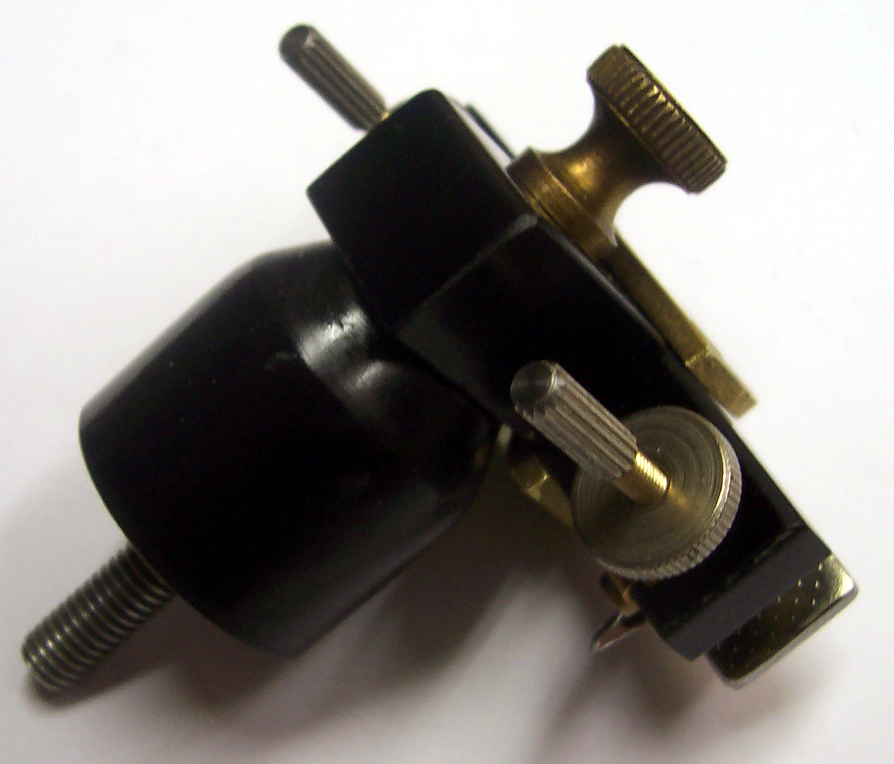 Bei meinem Depreze ist das schwarze Bakelit die Halterung. Das silberne Blech ist ein Stück Weicheisen, welches den in der Mitte gelagerten Anker bildet. Auf dem Anker ist ein Kontakt, dessen Gegenkontakt mit der einen horizontalen Rändelschraube verstellt wird. Die andere horizontale Röndelschraube drückt durch ein Loch im Anker auf eine Blattfeder, womit die Kontaktöffnungskraft eingestellt wird. Die obere Rändelschraube dient zum Verdrehen der Konstruktion , um so den Abstand Anker/Induktorkern einzustellen. Alles geschieht im zentel-mm-Bereich - den Anker sieht man nicht mehr schwingen.