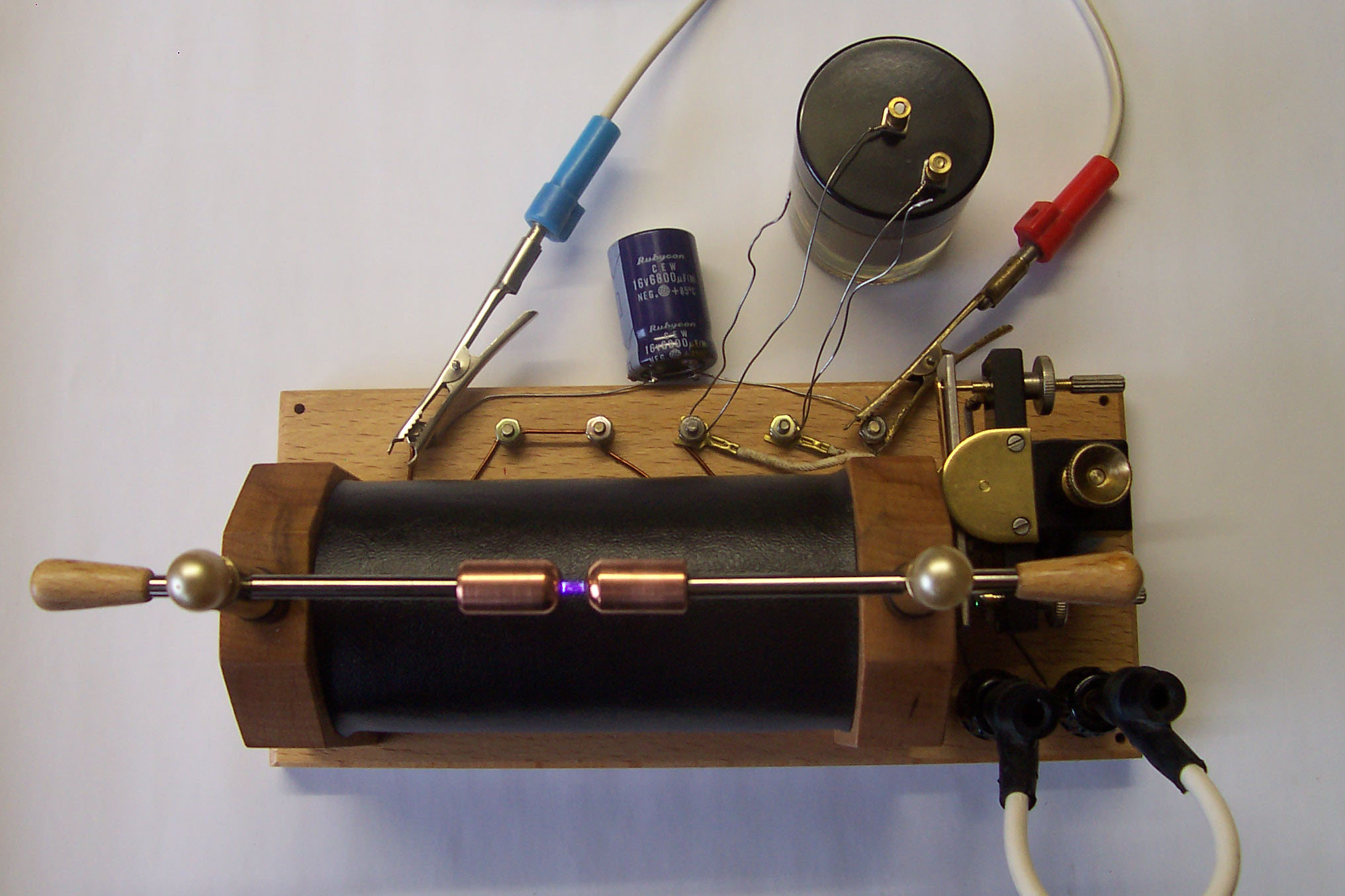 Um daraus einen Knallfunkensender zu machen fehlen nur noch der Schwingkreis bestehend aus einer spannungsfesten Spule und ebensolchen Kondensator in Form einer Leidner Flasche.