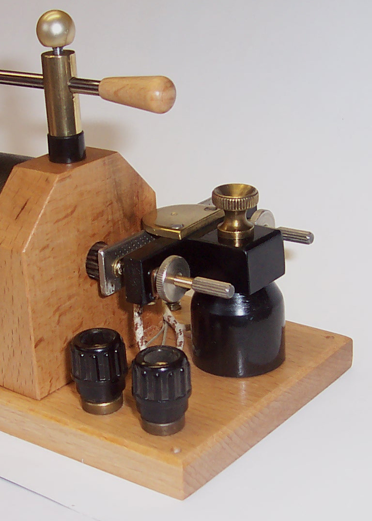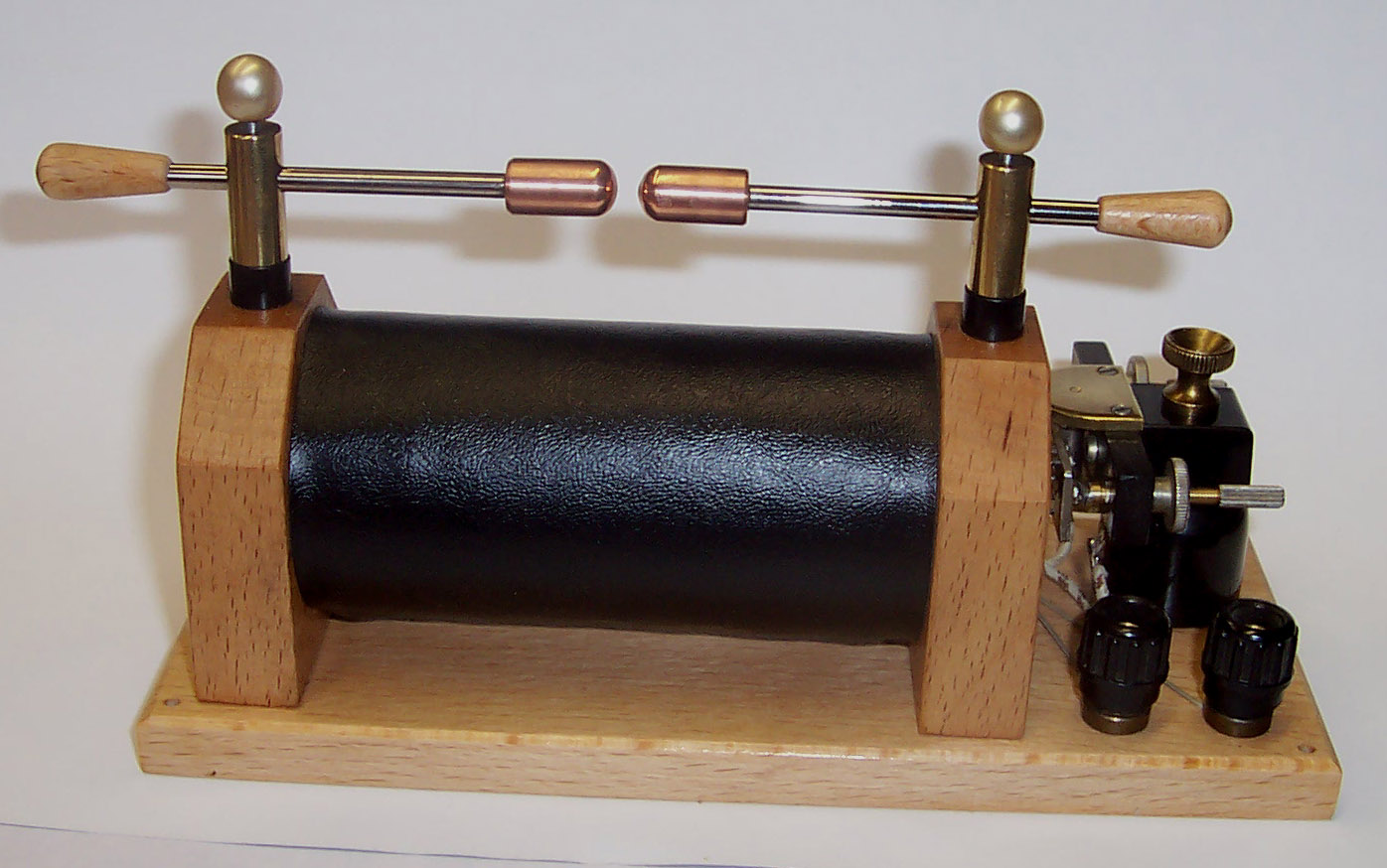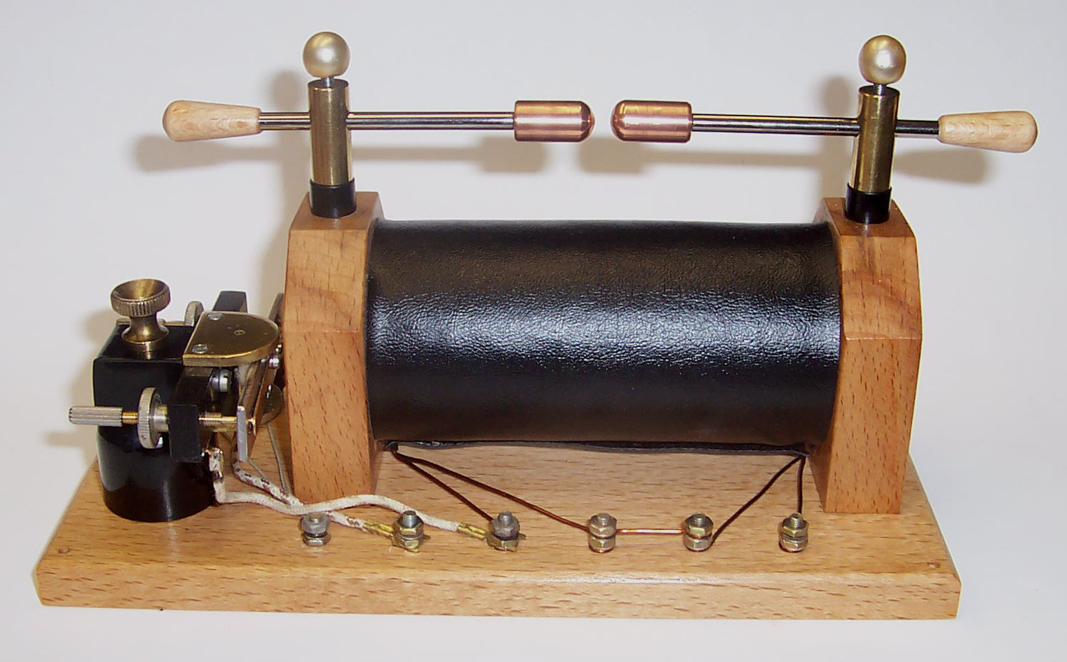 der Induktor ist nun auch optisch fertig und funktioniert. Als Unterbrecherkondensator dient der Wickel eines KFZ-Unterbrecherkondensators eingebaut in ein Glas mit Ölfüllung. Ob die Funkenstrecke so bleibt, weiß ich noch nicht. An den zwei Buchsen wird die Morsetaste angeschlossen. Alles Andere wird hinten an die Schrauben, wo mir noch paar Rändelmuttern fehlen, angeschlossen. Die Rändelmuttern am Kondensator sind geborgene Gewindehülsen, wie sie in Kunststoffgehäusen eingespritzt wurden.