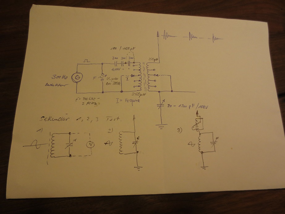 Nun wollte ich mal ein bisschen Draht und Erde anschließen....und dann wird es spannend, da sich die induktiven und kapazitiven Verhältnisse sekundärseitig ändern und auch auf den Primärkreis rückkoppeln. Um die Anpassung vorzunehmen, soll der obige Antennenkreis, Schaltung2 und Schaltung 3 verwendet werden. Als Referenz (Messung des Amplitudenmaximums) wird der Funkenempfänger mit Rahmenspule dienen. Der Fritter muss dazu raus...da er sonst detektiert und den Schwingkreis kurzschließt, parallel wird dort dann das Oszi angeschlossen.