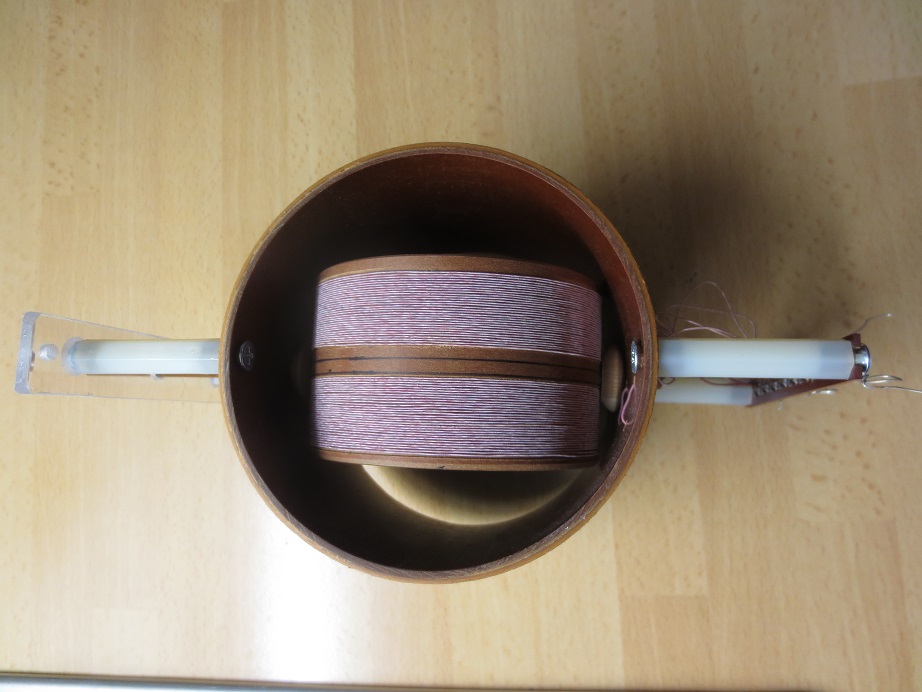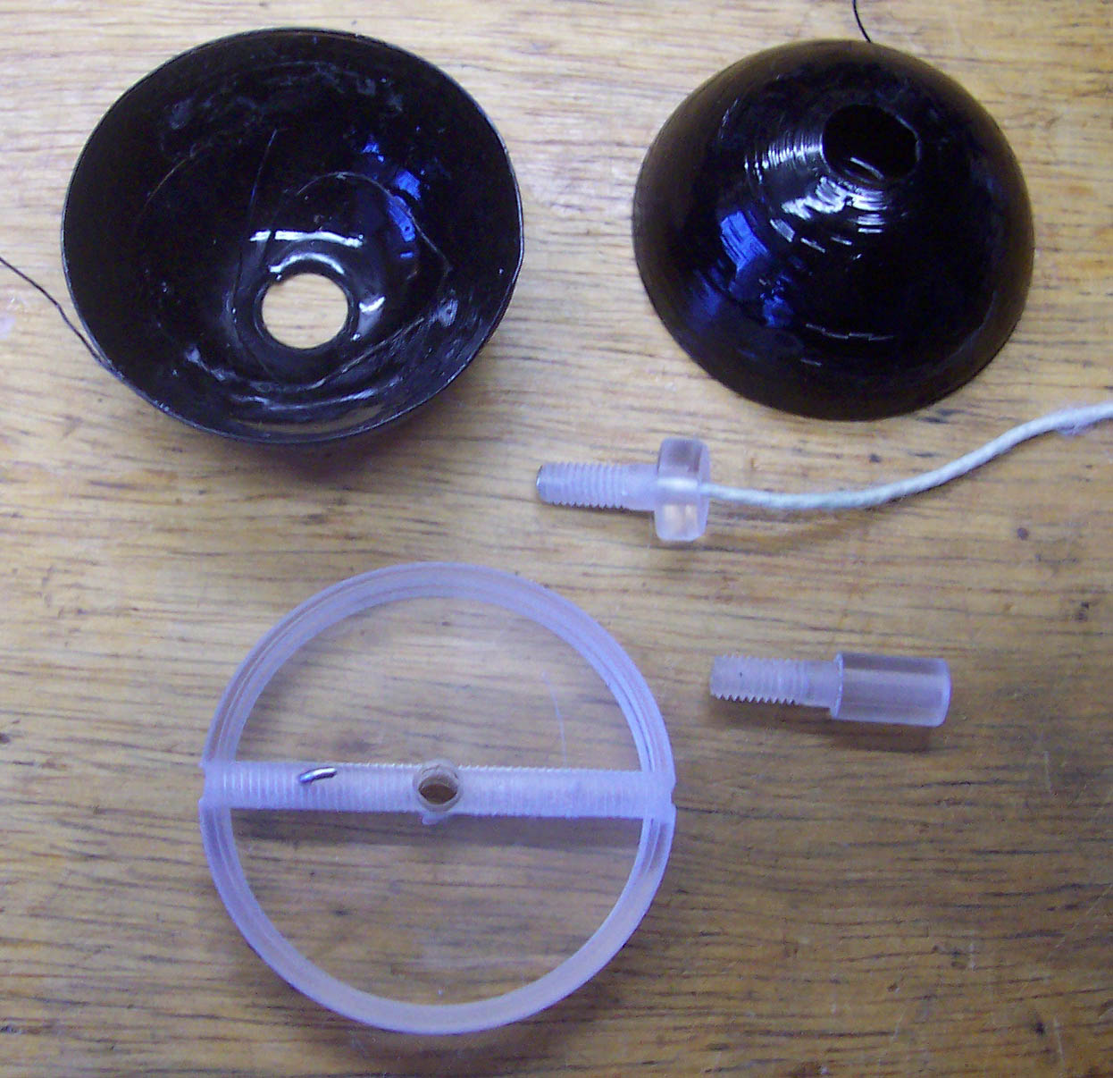 So, inzwischen ist die erste Halbwicklung des Variometers fertig - sie hat 115µH. Auf dem Bild sieht man den mit billigst Diamantfräßern aus dem Supermarkt gebohrten Glaszylinder , die fertige Halbwicklung und die zweite Hälfte die gerade in Arbeit ist. Als Spulenkörper habe ich eine Holzkugel mit einem festen Griff (rotes PVC) genommen. Die Hälfte wo man wickelt wir mit Silikonfett eingefettet und einziehen lassen die andere Hälfte wir mit Wasser angefeuchtet. Am Wicklungsende wird ein Nagel und etwas rechts davon ein Weiterer eingedrückt. Das Wickeln ist mit etwas Übung recht schnell per Hand machbar. Der Anfang wird mit klebeband am Griff befestigt und das Ende um die Nägel gewickelt. Vom Griff angefangen habe ich 0,3mm CuL vorsichtig mit gleichmäßigem Zug aufgewickelt. Besonders dem Ende zugehend muß man peinlichst darauf achten, daß Windung für Windung ohne Zwischenraum aneinander liegen , sonst hüpft der Draht beim witerwickeln herunter - nach dem dritten Versuch hat man es begriffen. Nach Dem Wickeln habe ich den Wickel mit Epoxidharz eingepinselt und drei Tage am heißen Ofen aushärten lassen. Durch die Hitze ist nun auch die Holzkugel ausgetrocknet und ein paar Hundertstel eingegangen. Mit leichtem Druck auf die Wicklung löst sich der Wickel unter leichtem Knacken von der Kugel. Danach wird die Innenseite noch mit Epx eingepinselt.