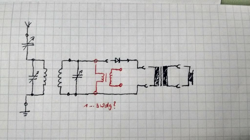 da gab es wohl ein Missverständnis. Der Trafo kommt an Stelle des Schwingkreises, also das eine Ende der Primärwicklung an die Antenne und das andere an Erde. Für optimale Anpassung ist ein Drehko parallel und/oder in Serie zur Primärwicklung sinnvoll, dieser wird dann auf maximale Ausgangsspannung eingestellt. Auf der Sekundärseite kommt dann die Gleichrichterdiode und danach der HF-Abblockkondensator.