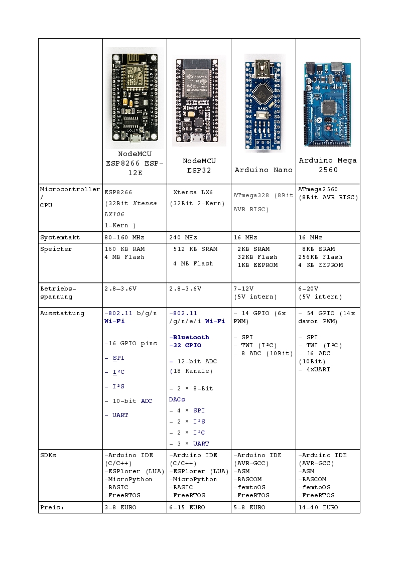 Einen kurzen Vergleich der NodeMCU-Module mit den bekannten Arduinos habe ich nachfolgend einmal angefertigt.