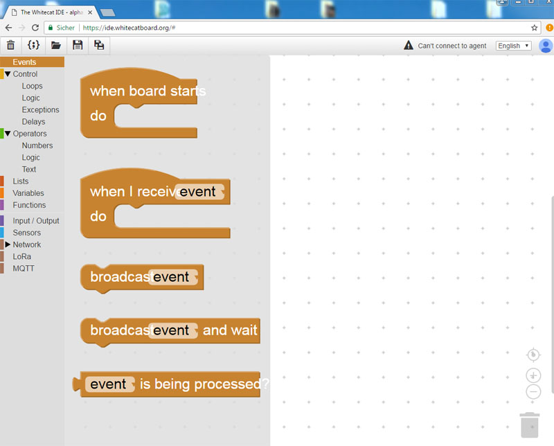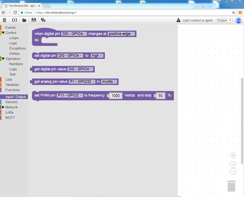 Die Programmierung unter diesem Betriebssystem gestaltet sich als sehr elegant und könnte für viele Neulinge hier im Forum ein Zugang zur Microcontroller-Technik bieten. Warum? Nun mit der "Whitecat IDE", einem Entwicklungssystem was vollständig im Webbrowser (vorerst nur Chrome) läuft, ist eine grafische Programmierung des Systems möglich. Dabei werden vorgegeben Funktionsbausteine direkt miteinander auf grafischen Weg verknüpft.