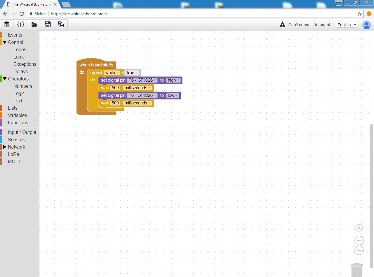 Wie würde nun unser Blink-Programm in der Whitecat IDE aussehen? So...
