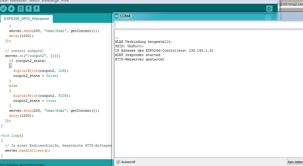 Nachfolgender Code bringt den Controller in ein WLAN hinein, dort stellt er einen Webserver (ein bisschen kleiner als der Webserver fürs WGF-Forum) bereit. Über die Webseiten des Webservers kann man zwei Ausgänge des Controllers umschalten. Meine Zugangsdaten habe ich natürlich "zensiert"