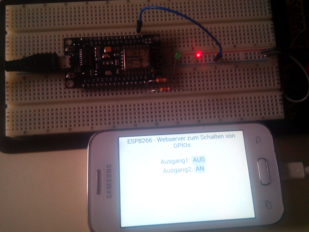 Mit einem Mobiltelefon kann man nun die Webseite des Controllers aufrufen und die beiden Ausgangspins praktisch überall auf der Welt umschalten.
