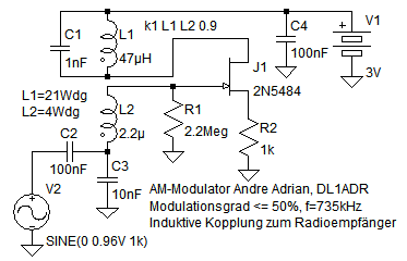Der AM-Modulator ist als Testumgebung für den Transistorempfänger für mich auch wichtig. Modulator und Empfänger Entwicklung gehen Hand in Hand. Hier die neueste Version. Einmal ist die Versorgungsspannung nun 3V. Bei 1,5V wollte der AM-Modulator manchmal nicht oszillieren. Zweitens ist nun ein Widerstand an der Source, nicht mehr am Gate.