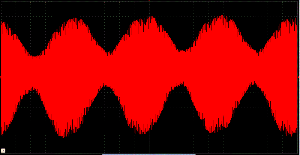 Bei ca. 100 kHz fängt es schon an, sichtbar zu werden. Das Oszilloskop (auf AC geschaltet) verschiebt die Signalkurve so, dass es wieder den Mittelwert anzeigt. Der virtuelle Koppelkondensator (des Oszilloskops) lädt sich dann mit der Demodulationsspannung auf. Tendenz ist klar: Wenn die Aufladung schneller vor sich geht als die Entladung, wandert das resultierende Potential ins Positive.