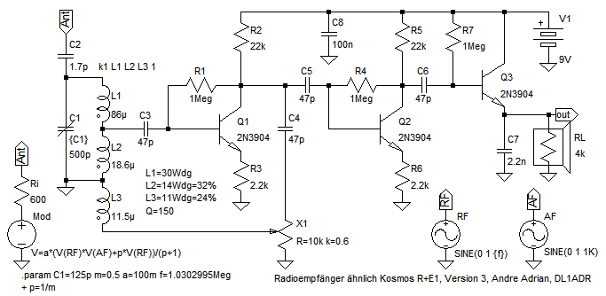 Diese Schaltung ist hochohmiger ausgelegt als die Kosmos R+E1 Schaltung. Deshalb ist die Versorgungsspannung mit 9V auch höher. Weiterhin wurden soweit möglich die gleichen Bauteilewerte benutzt. Die HF-Koppelkondensatoren haben alle 47pF. Zum Vergleich: Im AM-Empfänger IC TA7642 haben die HF-Koppelkondensatoren 12pF. Die Arbeitspunkteinstellung erfolgt bei Q1 und Q2 jeweils über drei Widerstände. Dabei erhöht der Emitterwiderstand den Eingangswiderstand der Stufe und reduziert die Verstärkung. Der Widerstand zwischen Basis und Kollektor bestimmt hauptsächlich den Arbeitspunkt, d.h. den Kollektorstrom. Nebenbei sorgt er für eine Gegenkopplung und reduziert den Klirrfaktor. Der Kollektorwiderstand wandelt die Kollektorstromänderung in eine Kollektorspannungsänderung um. Q3 arbeitet in Kollektorschaltung. Die Demodulationswirkung von Q3 kann ich nicht in LTSpice simulieren, aber die Schaltung funktioniert im Aufbau, natürlich wieder auf einem Steckbrett. Der Kopfhörer hat zweimal 2000 Ohm Widerstand.