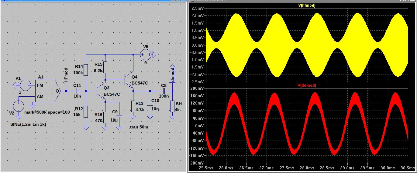 Ja, das ist bei LTSpice auch so und beim Aufbau auch so: ungefähr halbe Versorgungsspannung am Emitter von Q3. Eine Erklärung von Benutzer "Chris" habe ich hier gefunden: electronics.stackexchange.com/questions/667181/how-does-an-emitter-follower-work-as-an-am-detector Im Kern geht es um C7 schnell laden, langsam entladen. Ob diese Erklärung richtig ist, oder auch nur die wichtigste Ursache dieser Demodulation erklärt, weiss ich nicht. Die nächste Frage ist: was von dieser Hypothese kann man simulieren? Bis jetzt ist die Basis-Emitter Diode ja nur ein Spannungsunterschied von 0,7 Volt.