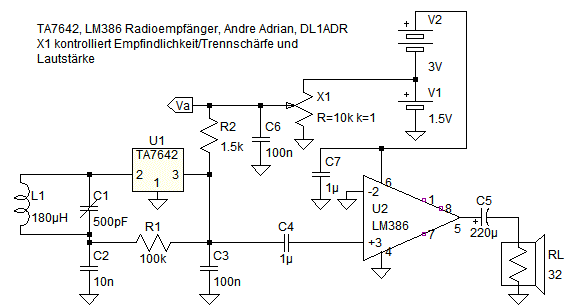 Hier im Forum wurde schon ab und an das AM Receiver IC TA7642 oder die ähnlichen Bausteine ZN414, YS414, MK484 und LMF501T angesprochen. Als "Referenz" zu den Selbstbau Transistor Einkreisern habe ich einen Radioempfänger mit TA7642 gebaut und auch simuliert. Dabei bin ich auf das gleiche Problem wie B. Kainka gestoßen. Er schreibt: "Falls es mit einem Schwingkreis hoher Güte zu Eigenschwingungen kommt, kann man einen Widerstand von 200 kOhm bis 1 MOhm parallel zur Spule schalten, um die Stabilität zu sichern ... Ein Kreis hoher Güte kann leicht in Rückkopplungs-Schwingungen geraten. Beim [Kosmos Bausatz] Retro-Radio wird eine Anzapfung am Schwingkreis verwendet, damit dieser Fall gerade noch nicht eintritt aber trotzdem gerade eine optimale Entdämpfung erreicht wird." Meine Lösung ist weder ein Dämpfungs-Widerstand noch eine Anzapfung der Schwingkreisinduktivität. Ich habe die IC Versorgungsspannung einstellbar gemacht. Für den direkten Anschluß eines Walkman Ohrhörer mit zweimal 16 Ohm Widerstand gibt es Transistor Q1 als "Endstufe".