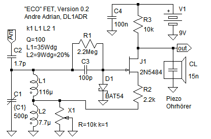 Der Thread "Radiomann AC122 Nestel-Audion" ist ein "Transistor RK-Radioempfänger simulieren und bauen" Thread geworden. In der Zwischenzeit sind 12J1L (russischer RV12P2000 Nachbau) Pentoden eingetroffen. Weil ein FET fast so wie eine Pentode funktioniert, habe ich ein "ECO" FET Audion simuliert und aufgebaut.