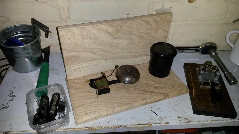 Nur die Spulen sind original aus einer alten Klingel. Der Rest ist Eigenbau aus Relaismaterialien , Messing, und Bakelit.