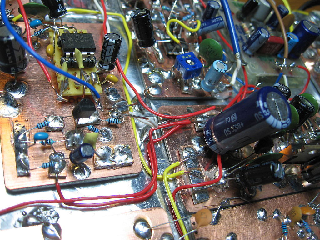 Zum Experimentieren besonders bei HF gebe ich alleine schon wegen der großen Massefläche der Manhattan Style Technik den Vorzug. Platinen aus Glasfaser lassen sich mit der Handblechschere schneiden, auch die Schnipsel, die ich mit Sekundenkleber befestige. Man braucht also wenig Werkzeug.