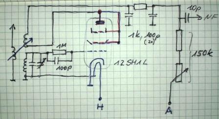Da ich mal ein Audion mit Triode aufbauen wollte, habe ich meine ECO-Schaltung umgebaut. Als Triode kam ein Nuvistor vom Typ 6S51N-V und 6S52N-V zum Einsatz. Da ich ja mit 12 Volt Anodenspannung arbeite, war ich gespannt auf die Funktion. Beide Nuvistoren zeigten bei der geringen Anodenspannung sehr gute Empfangsergebnisse. Viele unterschiedliche Sender konnten im Kurzwellenbereich klar und deutlich empfangen werden. Auch auf den Empfangenen Amateurfunkbändern konnten gute Ergebnisse erreicht werden. Die Einstellung der Rückkopplung mit dem "Klebestift-Variometer" ging leicht von statten, wobei parallel auf die Antennenanpassung zu achten war. Die Antennenanpassung hatte ich mit einem "Spartrafo" realisiert. Zu guter letzt habe ich zum Vergleich eine 12SH1L als Triode geschaltet, und muss sagen, dass die Empfangsergebnisse mit der 12SH1l als Triode etwas besser waren als mit den Nuvistoren.