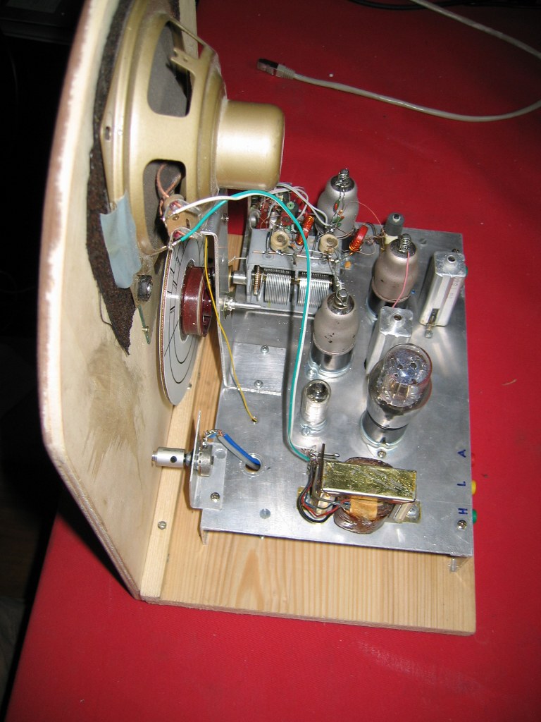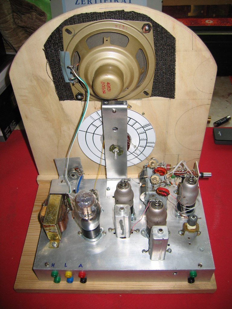 Hallo Miteinander. Also mit abschließenden Schaltplan ist es so eine Sache.Vorläufiger Schaltplan passt besser. Elektronisch hat sich noch verändert, das ich als NF Treiber eine 1T4 eingebaut habe.Die beiden Trioden der R212 habe ich parallel geschaltet. Die Lautstärke ist jetzt so hoch, das man sogar ab und zu den Lautstärke Regler benutzen muss. Die 1T4 war da.Und so Schlecht macht sie sich gar nicht einmal.Obwohl eine große Noval Röhre schon schöner gewesen wäre. Das Chassis ist von Schrott.Es besteht nur aus einer Alu Platte und Zwei Winkel.Die Winkel sind aus einem Stück Vierkantrohr das ich mit der Tischkreissäge Längs geteilt habe. Die Gehäusefrage hat sich auch gelöst.Ich möchte die Vorderfront und den Boden aus Holz und die Seite aus Plexyglas machen. Die Holzteile sind gebohrt und verleimt.Jetzt geht es die Tage noch an das lackieren.