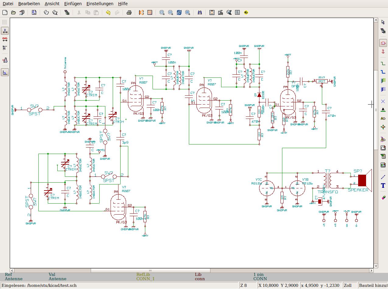 Hallo Joe,hallo Miteinander Skalenbeleuchtung ist schon drin.Man kann sie auf den Fotos nur nicht sehen.es ist ein Kugelbirnchen 3,2 V etwas dunkel,aber ausreichend. Knöpfe habe ich jetzt auch welche bekommen.Nun suche ich noch etwas Messingblech um die Front ein wenig verzieren zu können. Ich lade dann noch ein Foto hoch wenn ich fertig bin. Den Schaltplan habe ich dieses mal versucht auf Kicad zu zeichnen.Ist etwas gewöhnungsbedürftig.Aber wenn man sich ein wenig eingewöhnt hat macht es fast Spaß. Im Großen und Ganzen hat mir das Projekt doch viel Freude bereitet.Auch wenn es eigentlich nur ein Dampfradio werden sollte. Jetzt wäre eigentlich der richtige Zeitpunkt sich zu überlegen ob man nicht was Neues beginnen sollte. Mal schauen LG Norbert Wenn ein FS mit 15 Röhren läuft, ist der Anblick durch die Rückwand auf jeden Fall schöner und interessanter wie das Programm auf der Mattscheibe.