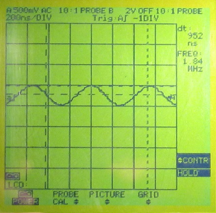 3. Messung der Resonanzüberhöhung im Variometer- / Fritterkreis. Fritter nicht eingesetzt....also unbelastet. Resonanzspannung im Kreis = 1.7Vss ca. 1 : 3,4 bei 1.84MHz