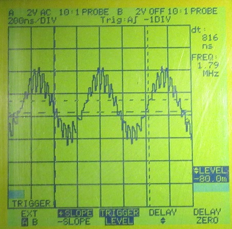 2. Messung direkt hinter Anpassvorwiderstand (Rv) zu Masse. Spannung durch Rv auf 50% ca. 6dB abgesenkt. 500mVss. Messung an Koppelspulenantennenanschluss (Isolator) und Erdbuchse des Empfängers. Es ist nur eine geringe Phasenverschiebung vorhanden, daher nur ein Oszillogramm.