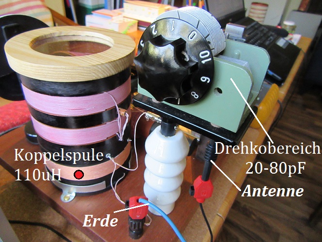 Hier der improvisierte Aufbau am Antenneneingang im Plan und als Bild... Eine serielle Antennenkreisabstimmung mit einem alten Flohmarktdrehko von 500pF Kapazität. Nur der eingezeichnete Bereich im Praxisbild ist für meinen Aufbau relevant. Also eigentlich zu groß das Teil.