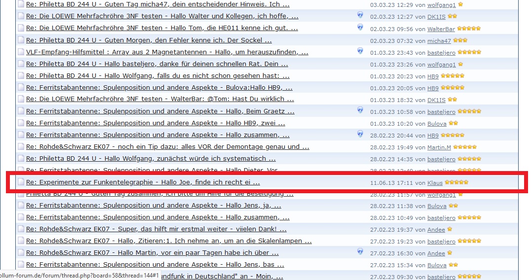 Hallo Rainer, es wird am 28.02.2023 nicht der Beitrag von DL4KE angezeigt ( siehe Blatt 68) sondern ein Statement von unserem schon lange verstorbenen Klaus vom 11.06.2013 auf Blatt 1. Auch die Sternchenbewertung ist in meinem Beitrag nicht mehr vorhanden... naja, ist halt ein sehr alter Thread.