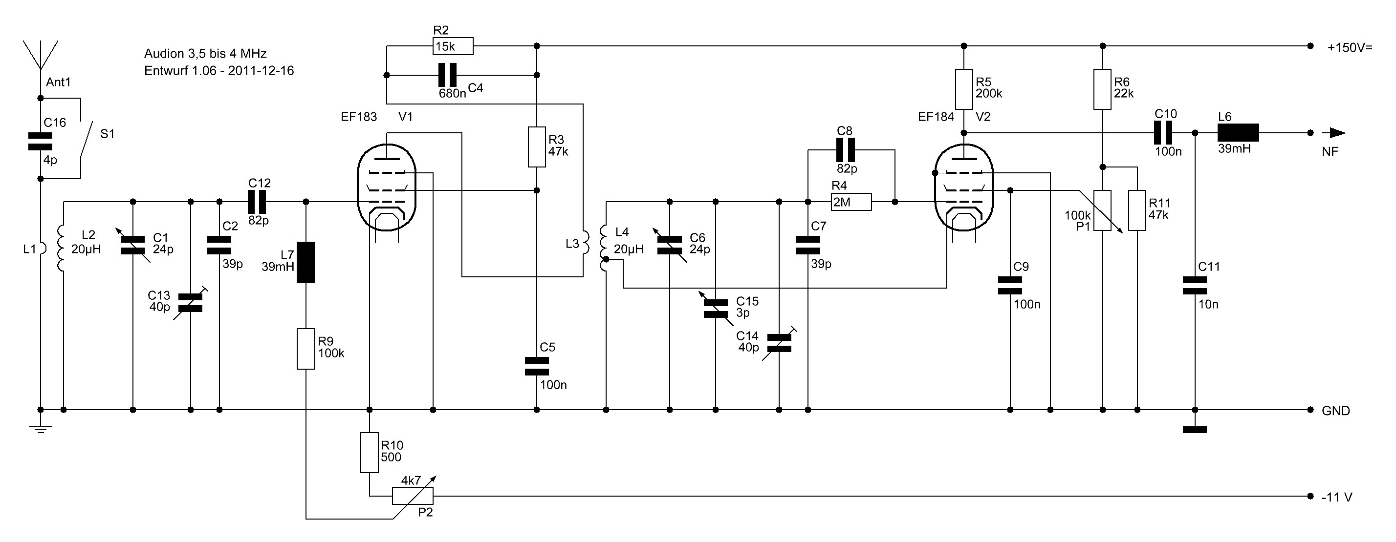 - Ich habe die beiden Schwingkreisspulen durch eine abschirmende "Wand" getrennt. - Die Heizleitungen habe ich nun jeweils mit 22nF direkt am Röhrensockel nach Masse geblockt. - Die Antenne kann wahlweise direkt oder über 4pF angeschlossen werden. - Änderung der Widerstände, die für die Rückkopplung zuständig sind. - Extremes verkleinern des Eingangskondensators der Vorstufe - Vorherigen Anodenwiderstand der Audionröhre (200K) wieder eingelötet.