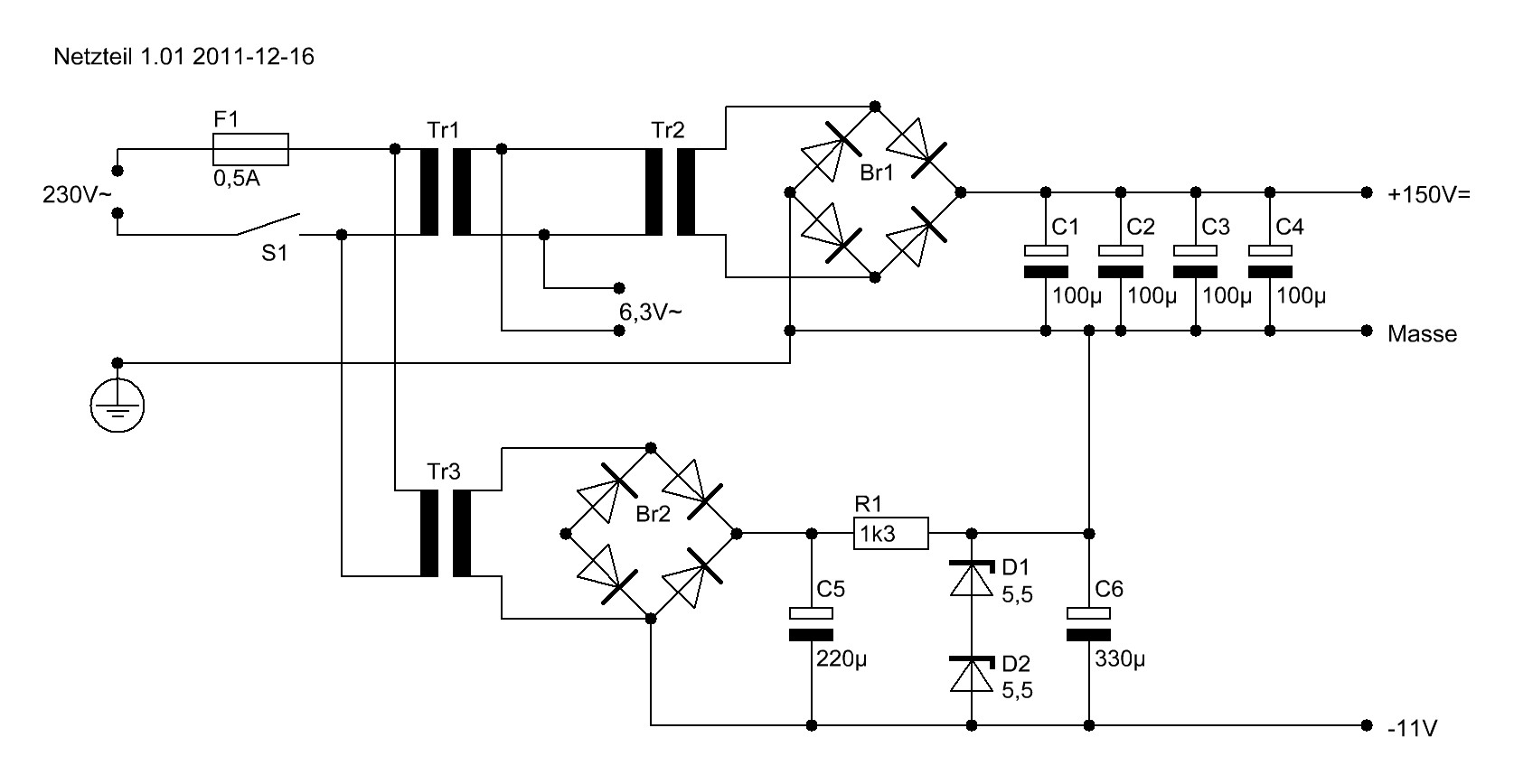 Ich denke, dass ich noch ECC81 oder ECC82 habe. Die werde ich aber mit 6,3 Volt heizen müssen. Die stabilisierte 12 V Versorgung ist dafür viel zu klein bemessen. Die kann nur knapp 0,5 Watt liefern. Sie besteht aus einem Minitrafo 12V 0,5 VA, Gleichrichter, Elko, Vorwiderstand, 2 Z.Dioden 5,5Volt und einem weiteren Elko. Die 0,5 Watt fallen schon fast komplett an der Stabilisierung ab. Die Anodenspannung erzeuge ich derzeit übrigens über das Hochtransformieren der Heizspannung mit einem getrennten Trafo. Bei den vorhandenen Trafos für Röhrenschaltungen lege ich bereits bei den abgreifbaren Wechselspannungen über den aximalen Anodenspannungen der Röhren. Und direkt ans Netz ohne Trenntrafo ist mit mir nicht zu machen. Viel zu gefährlich bei meiner Schusseligkeit