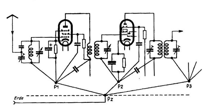 Die Verteilung der einzelnen Schaltelemente auf dem Chassis muss so erfolgen, das so wenig wie möglich Schaltdraht benötigt wird. Das Gerät muss mechanisch stabil aufgebaut werden, kein Teil darf sich bei Erschütterung bewegen. Die Anordnung der Teile muss auch nach thermischen Gesichtspunkten vorgenommen werden, alle frequenzbestimmenden Teile L + C durfen sich nicht erwärmen. Diese Teile werden unter der Grundplatte befestigt, alle Wärmeerzeuger, wie Röhren, Hochlast - R und Trafos über dieser Grundplatte kommen. > Das Metallchassis des Empfängers darf nicht als Leiter für irgendwelche Stromkreise benutzt werden. Das Schalten muss so vorgenommen werden, als sei das Chassis nicht leitend. Das Metallchassis ist möglichst nur an einem zentralen Punkt zu erden. Alle Nullpotential führenden Leitungen sind in einem Punkt zusammenzuführen. Bei größeren Geräten macht man mehrere Erdungspunkte, die dann zentral zusammengeführt werden. < Netzleitungen müssen gegen HF verdrosselt werden, ebenso wie die Gleichspannung Versorgung im Gerät HF geblockt werden muss. Diese Regel gelten eigentlich für alle Röhrengeräte auch für NF. Zum Schluss noch eine Grafik die das veranschaulicht.