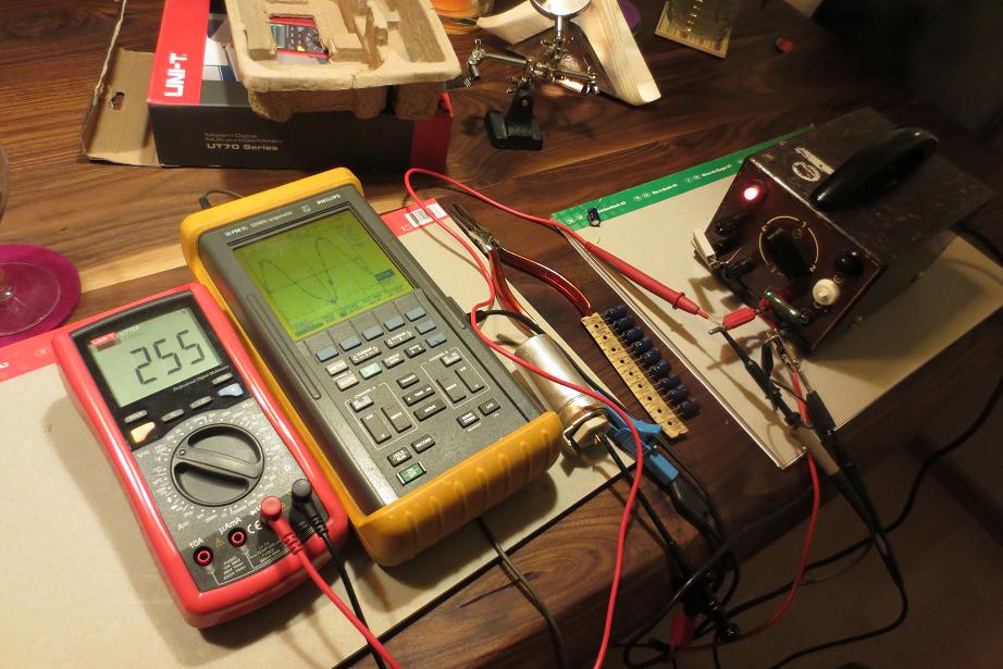 Anodenspannung 18VDC, 30VDC, 130VDC, 260VDC Stufe 4-1 mit 3,9k Last. AC mit Multimeter <1mV/ Messung mit Oszi noch offen. Mit 15k Last bis 330VDC. (U_Dach)
