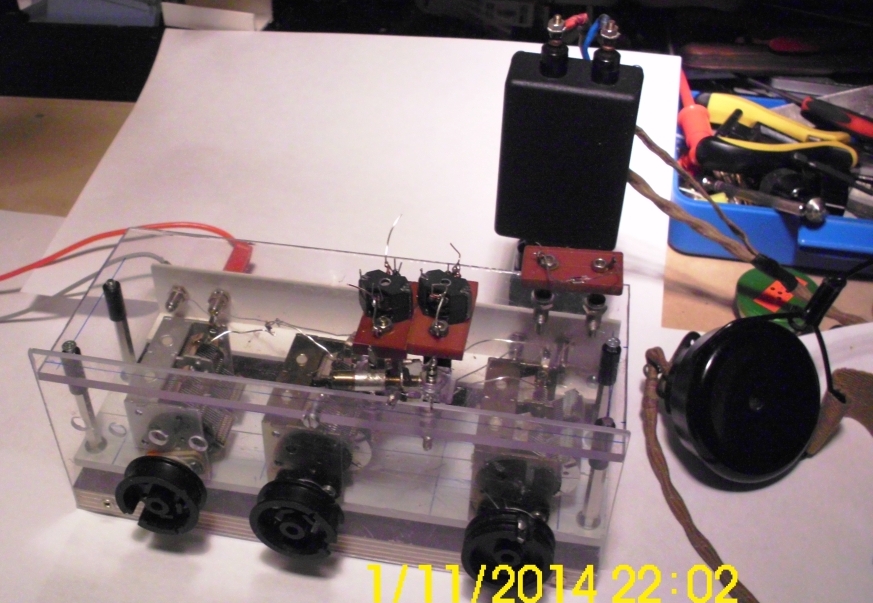 der Umbau ist somit fortgeschritten dass ich die ersten Empfangsversuche durchführen kann. Alle 3 Drehko's sind in der unteren Ebene angeordnet um nach oben kurze Verbindungen zu den Spulen zu realisieren. Die zwei Spulen der Kreise sind über Telefonbuchsen mit dem Drehko verbunden. Über zwei weitere Telefonbuchsen können die Kreise bei Bedarf einfach kapazitiv gekoppelt werden. Über die Diode (2 Telefonbuchsen) geht es direkt zum Ausgang bzw zur externen Kopfhöreranpassung. Die Kopfhöreranpassung (2 Pikatron 80 C 786 in Reihe mit 100000 Ohm zu 400 Ohm.) sind im schwarzen Kasten hinter dem Detektor angesteckt. Der Kopfhörer ist ein englischer DLR Nr. 5 sound powered Kopfhörer.