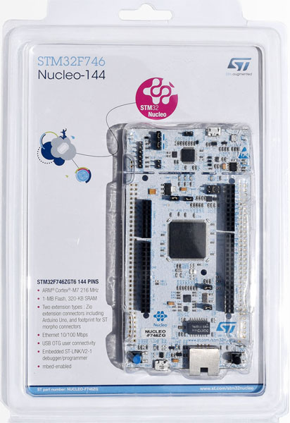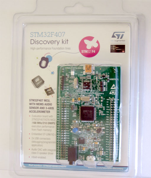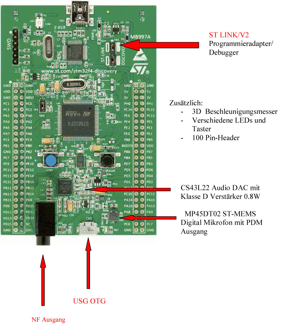STMicroelectronic liefert für die DSP-"Fetischisten" unter Uns die Boards auch gleich mit allen nötigem Zubehör aus. Neben dem Hauptprozessor mit 168 oder 216 MHz-Taktfrequenz, 1MB-Flashspeicher und 192 oder 320 kB RAM, sowie 2.4 MSPS schnellen Analog-Digitalwandlern, zwei 12-Bit DACs, gibt es dort den CS43L22 Audio-DAC mit Klasse D-Verstärker und 0.8 Watt Ausgangsleistung. Zusätzlich ein "Digital"-Mikrofon mit PDM-Ausgang und weitere Spielereien wie 3-Achsen Gyroskop, 3D-Beschleunigungsmesser, 3-fach Magnetfeldsensor usw. Der Programmieradapter (ST-Link) mit Debugging-Fähigkeiten ist natürlich auch mit auf dem Board. Alles zum Preis eines Arduino MEGA-Boards.