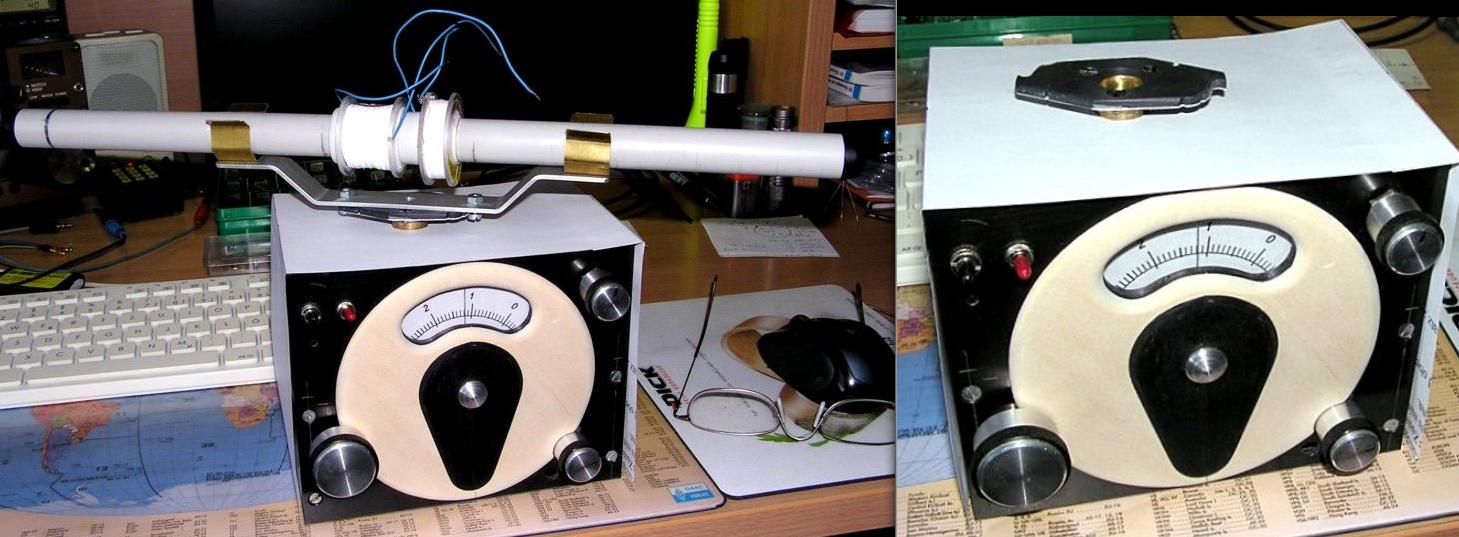 Die Ferritspule soll noch in ein Schutzrohr. Die Ferrithalterung wird mit einer Art Bajonett auf dem schwarzen Plastikteil befestigt, der Ferritstab selber durch die beiden Klammern aus Federmessing gehalten. Die Welle ist hohl, sodaß die Kabelzuführung nach oben im Drehpunkt erfolgen kann. Der Drehwinkel ist auf 180° beschränkt.