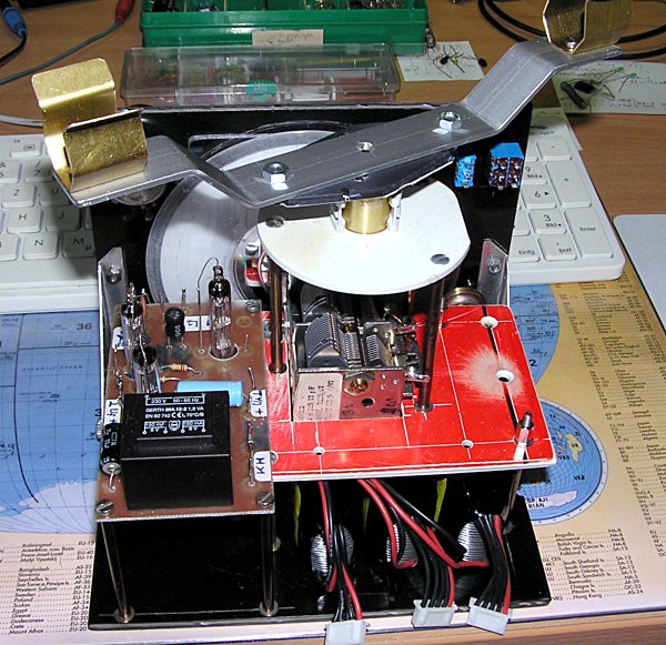 Unterhalb des Drehkos wird die Anodenbatterie ihren Platz finden, die aus drei LiPo Akkus 3 x 14,5V besteht. Unterhalb der Platine ist der Platz für die Heizbatterie vorgesehen. Das ist noch eine ungeklärte Sache: Habe kürzlich mal das Anlaufverhalten der Heizung einer invaliden 1Ж29 aufgenommen, die auf Grund eines "Unfalls" nur noch einen Heizfaden hat und für den Test gerade recht kam.