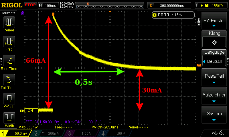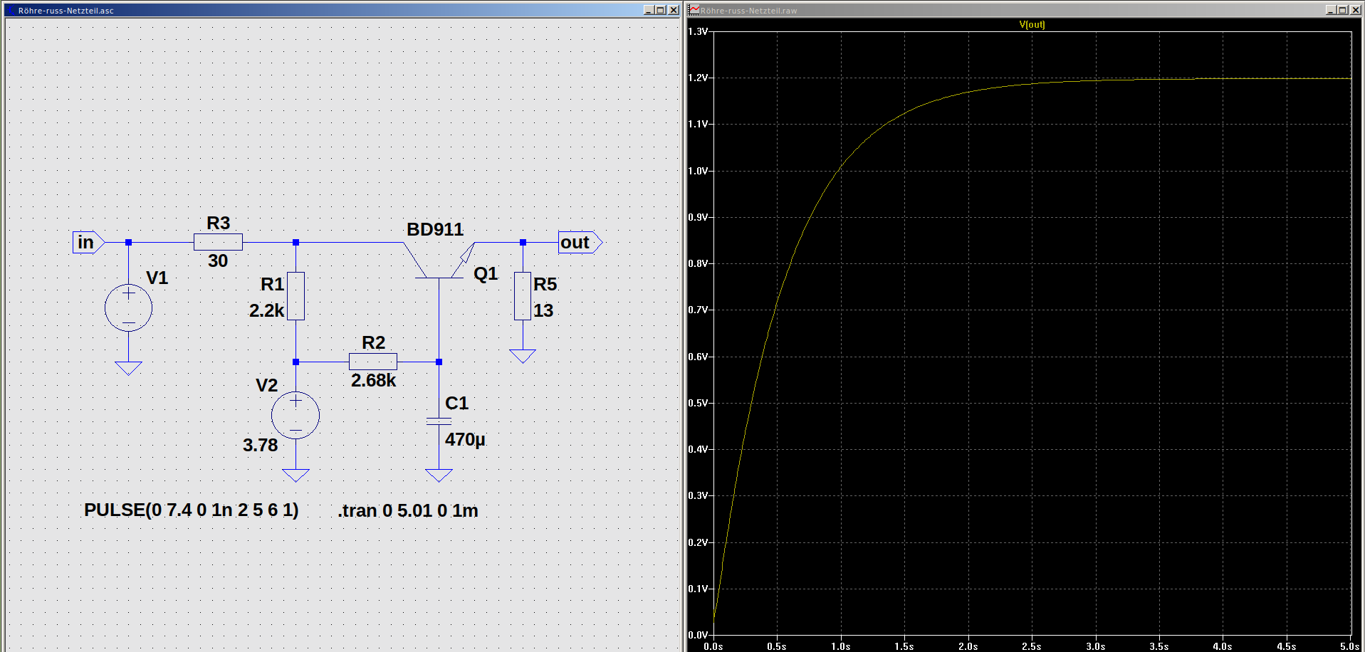 Der Meßwiderstand betrug 5Ω und wie man sieht, wird die Röhre etwa 0,5 Sekunden lang überheizt. Wäre es nicht besser, die haarfeinen Heizfäden mit einem Sanftanlauf zu schonen? Eine entsprechende Schaltung könnte recht simpel konstruiert sein. Habe mal eine Idee in Spice simuliert.