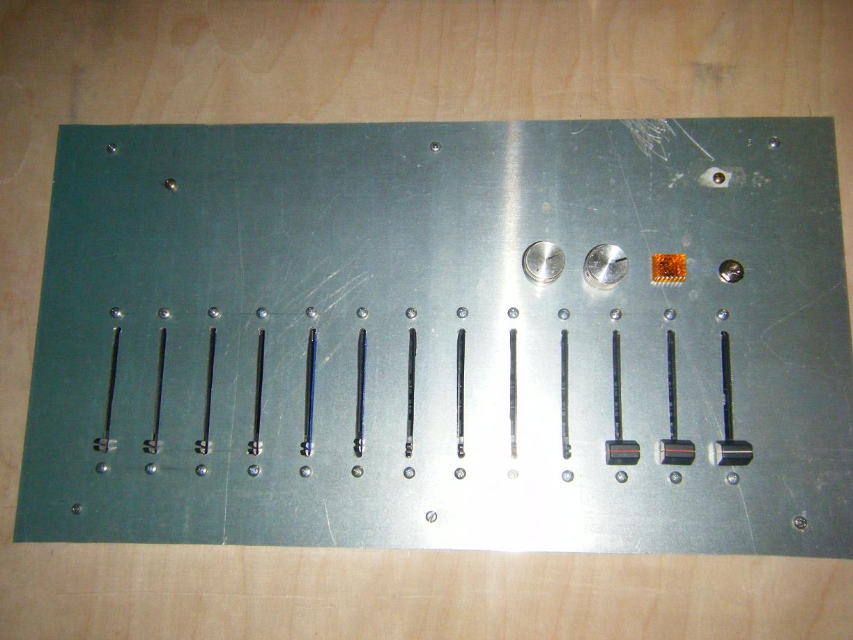 dann ist das Mischpult ja fast fertig. Ich hätte aber doch versucht, die Pegelmesser direkt einzubauen. Die große Platine in der Mitte der Anschlußseite läßt sich sicher auch anders platzieren. So hättest Du doch über den Schiebereglern Platz. Dann nur noch die Knöpfe in der vorhandenen Art vervollständigen.