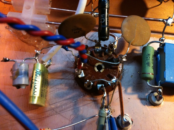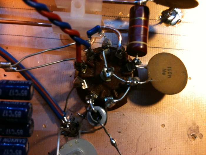Die Audionstufe aus Richtung der Vorstufe gesehen. Das blau-rote Massekabel und die verdrillten Drähte für die Heizung führen nach "oben" über die anderen Bauteile. Oben links das Wendelpoti für die Rückkopplung.