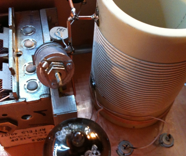 Die Spule der Audionstufe mit den frequenzbestimmenden Kondensatoren: